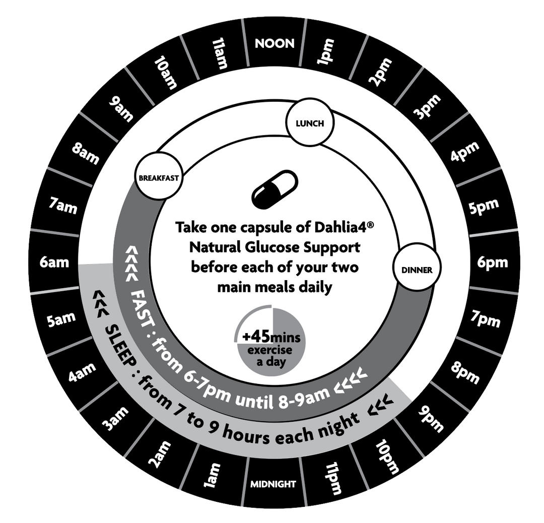 Dahlia4® is part of a healthy living programme. It should be combined with a lifestyle that includes 3 pillars of healthy living: healthy eating, regular exercise, and sufficient sleep. We have developed a healthy lifestyle management plan based on the latest scientific evidence, as we want you to maximise the benefits of Dahlia4® natural glucose support.